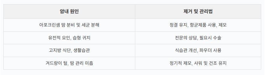- 식습관 및 생활환경: 고지방, 고칼로리 식단, 스트레스, 땀을 자주 닦지 않는 습관 등이 암내를 악화시킬 수 있습니다.