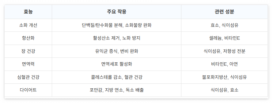 - 항산화 작용: 셀레늄, 비타민E 등 항산화 성분이 풍부해 활성산소 제거 및 세포 손상 예방, 노화 방지, 만성질환 예방에 기여합니다.
