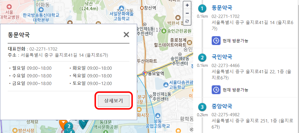 상세보기를 클릭하시면 주소, 전화번호 등이 나옵니다.